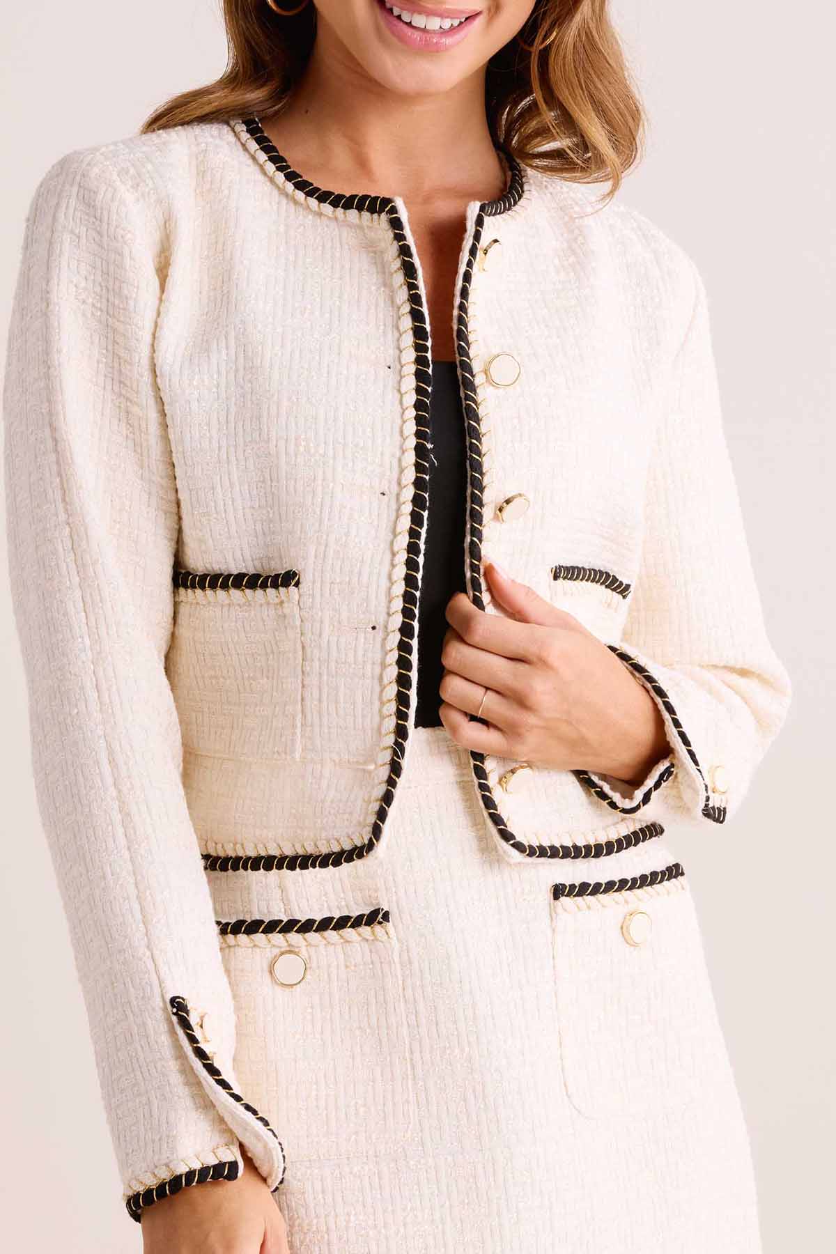We love the braided trim and and gold buttons. So versatile, pair with a bodysuit and denim for a casual look or tailored pants for an office fit thats sure to bring the compliments.Hand wash, hang to dry